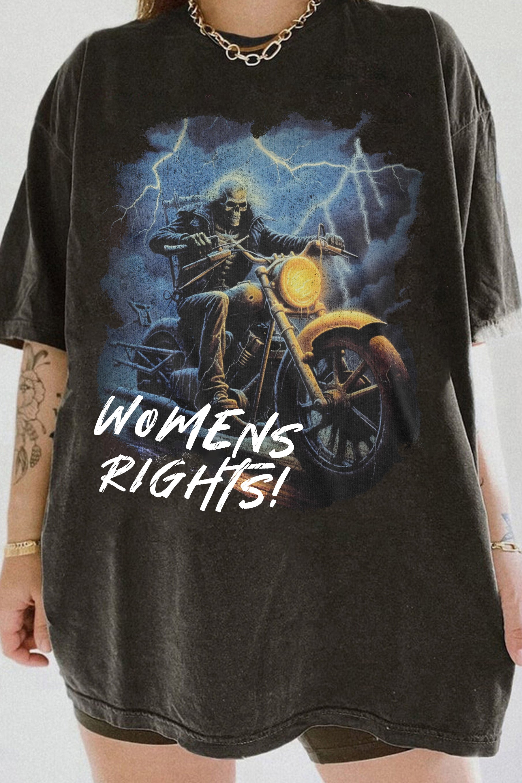 Womens Rights Skeleton Riding A Motorcycle Through Lightning Tee For Women