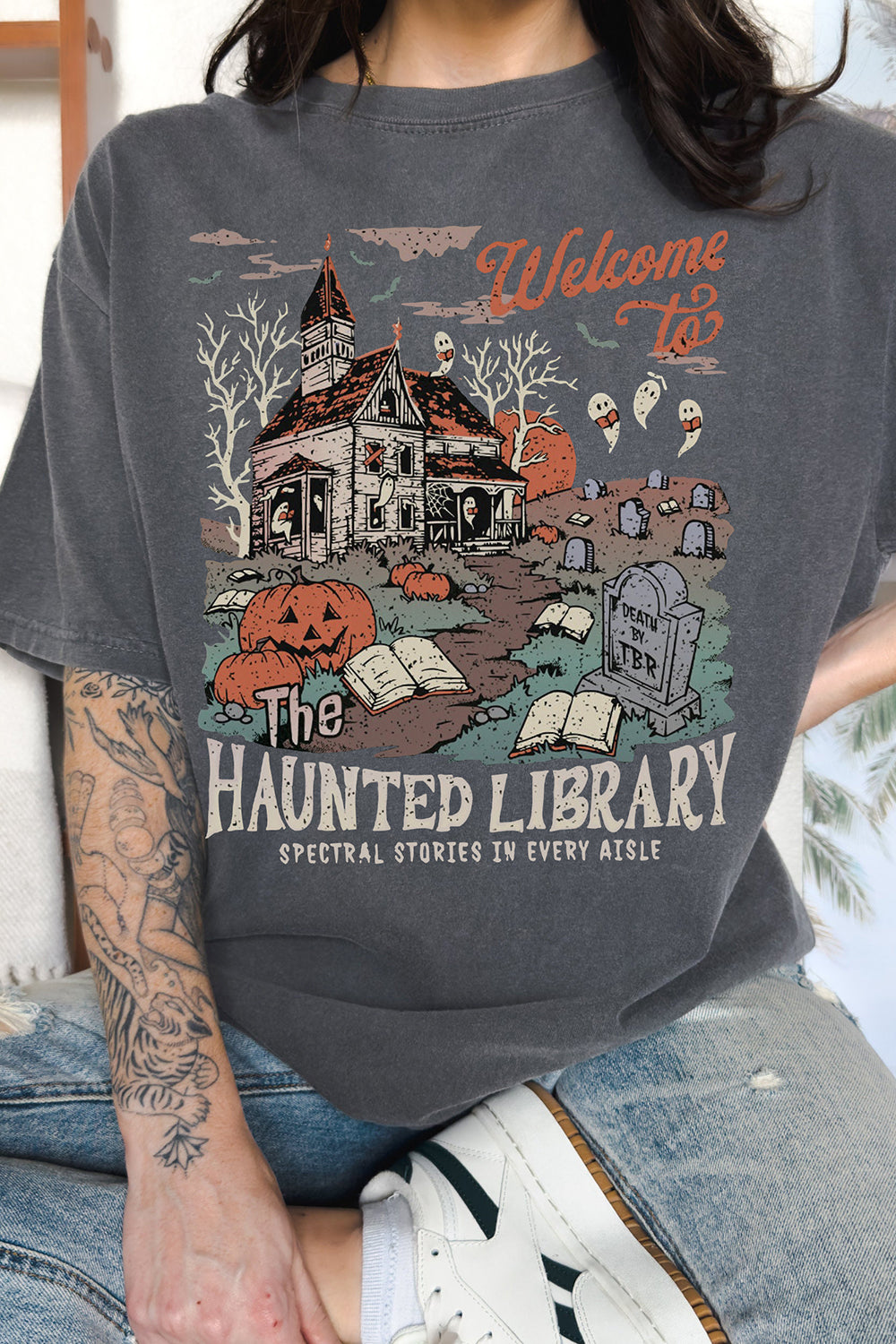 Haunted Library Funny Halloween Librarian Graphic Tee For Women